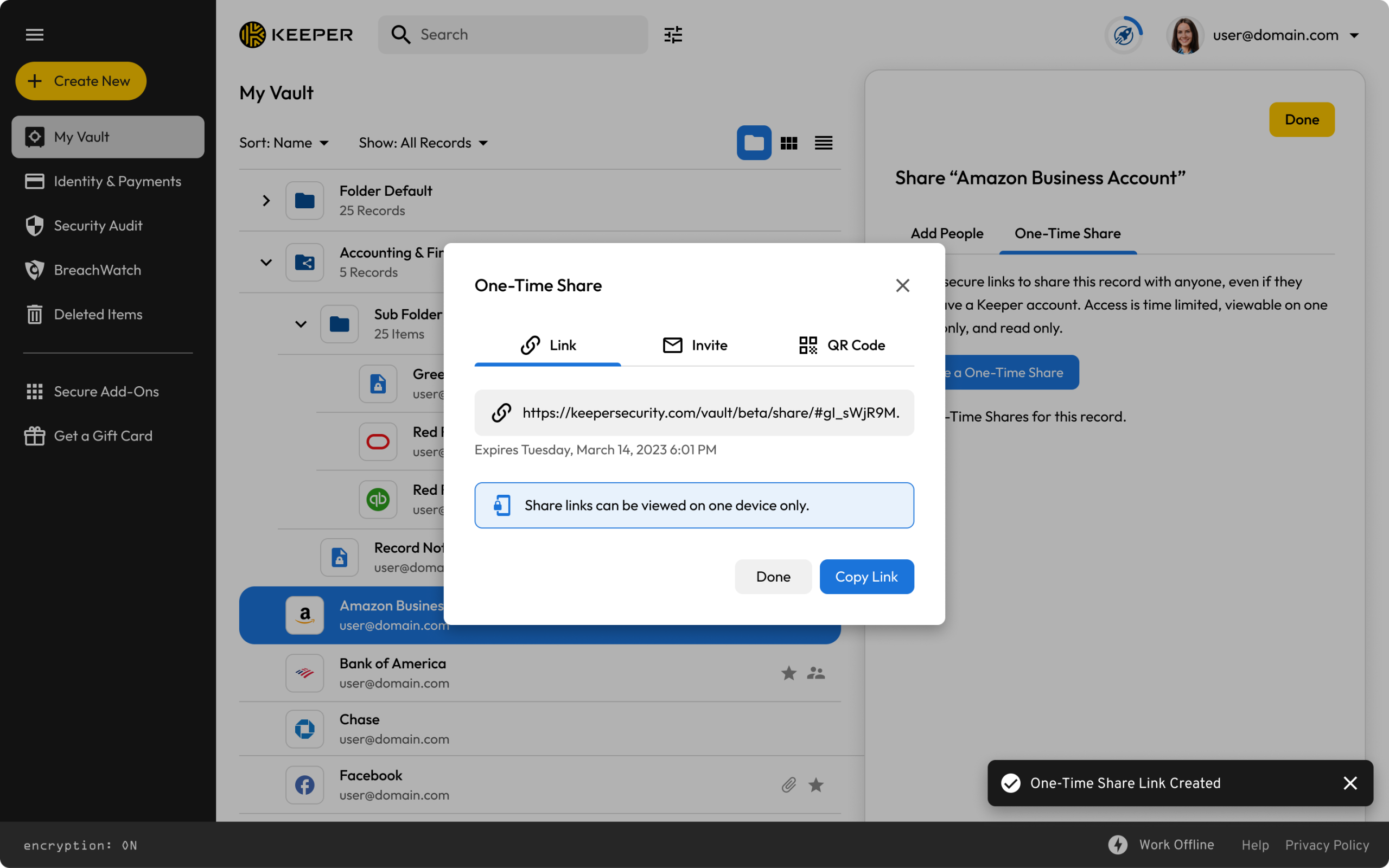 借助 Keeper 单次共享功能,摆脱繁琐,与无 Keeper 帐户人员轻松共享机密信息。 单次共享功能提供限时“只读”访问权限,允许向任意对象开放 Keeper 记录,规避邮件、短信或即时通讯的信息泄露风险。