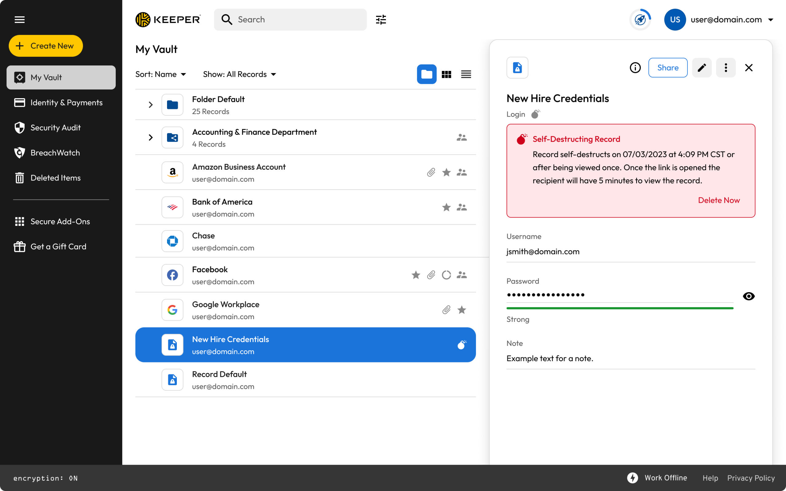 自毁记录还利用了 Keeper 的一次性共享技术,允许您与 Keeper 之外的用户共享记录。 然而,它们的独特之处在于,一旦共享链接在您选择的时间过期,记录就会自动从您的保险库中删除。 此功能在记录与收件人共享后不再需要时特别有用。